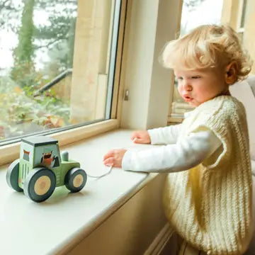 This lovely wooden Tractor pull along is the perfect traditional wooden toy. Painted in bright colours, this cute little vehicle will follow your little one around as they pull it along with the soft cotton string. Perfect for encouraging those first steps. This product is made from FSC® - certified wood & comes in beautifully designed, fully recyclable packaging.